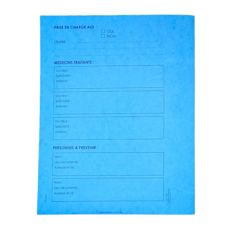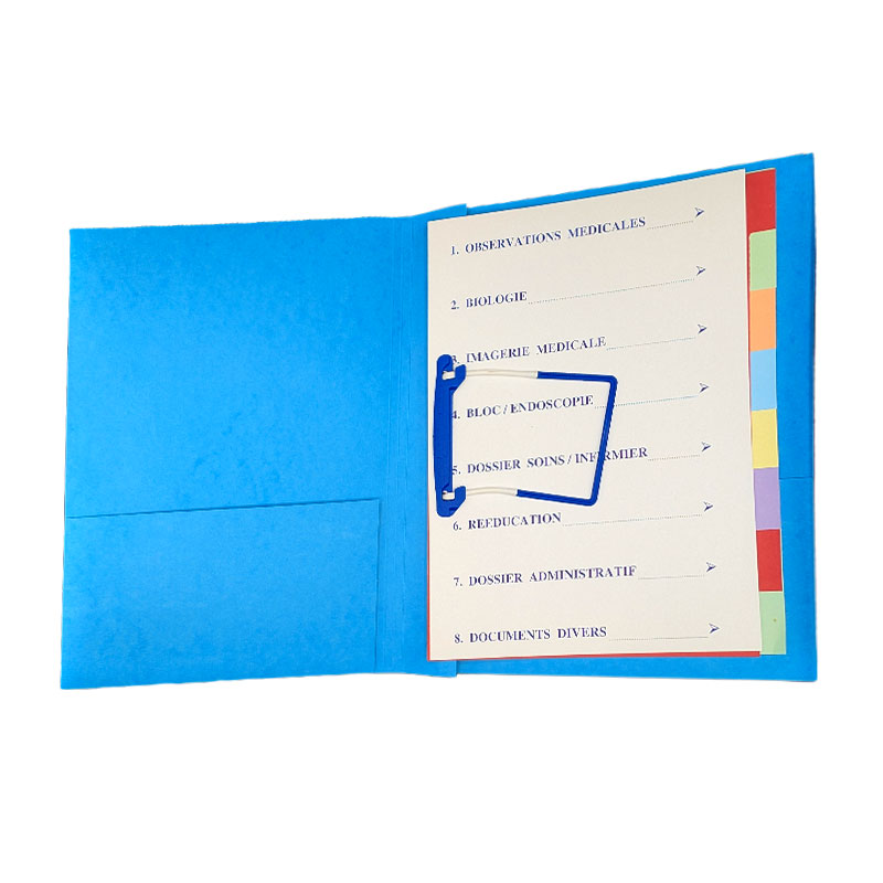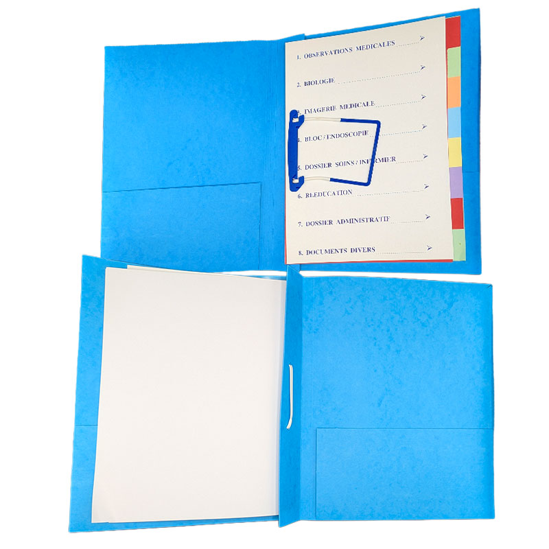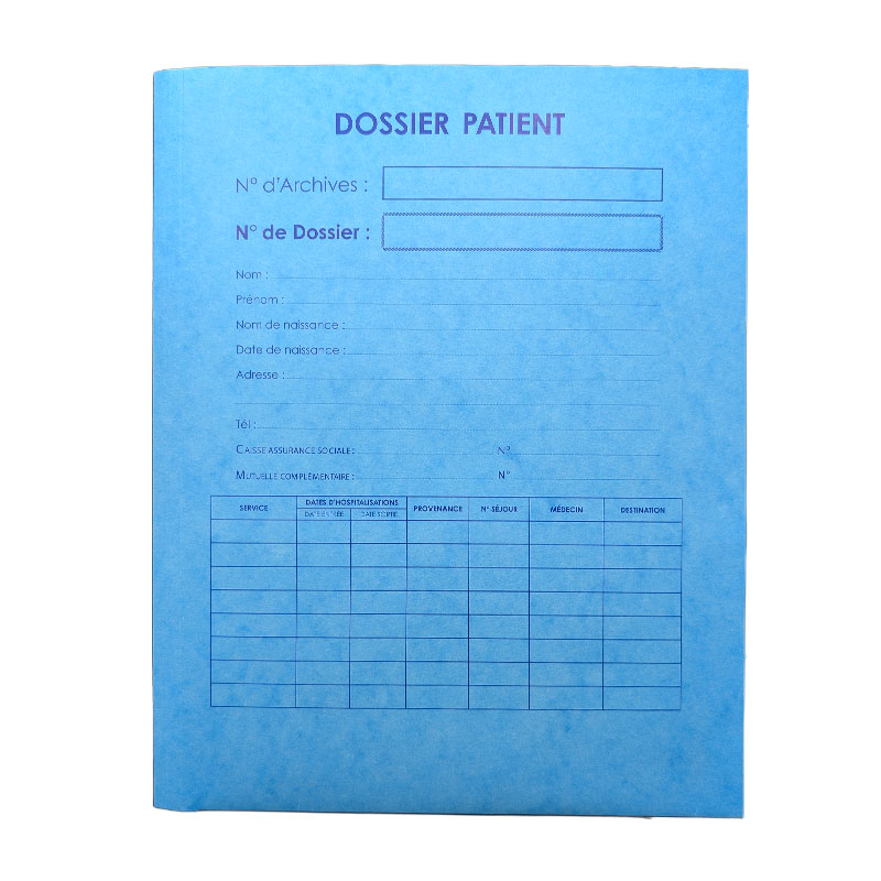 Tous les documents (ordonnances, feuilles de soin, comptes-rendus d’intervention, fiches de suivis…) doivent être classés dans le dossier patient. Les modèles standards des dossiers patients fabriqués par Luquet et Duranton ont été étudiés et optimisés grâce à l’expérience acquises auprès de nos clients. Ils permettent un archivage facile de tous les documents grâce aux 8 intercalaires incluses dans le dossier. Cela permet de retrouver rapidement un document en cas d’urgence.