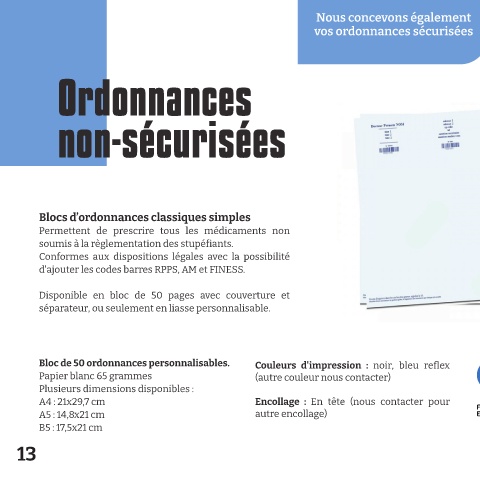 Bloc de 50 ordonnances personnalisables. Couleurs d'impression : noir, bleu reflex