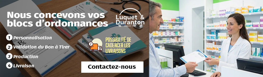 Bloc d’ordonnance sécurisée : pour la prescription de médicaments classés comme stupéfiants. Ces ordonnances possèdent des caractéristiques spéciales permettant d’optimiser la sécurité et de limiter les fraudes. Seuls quelques imprimeurs sont autorisés à fabriquer ces ordonnances sécurisées. Luquet & Duranton fait partie des imprimeurs certifiés par l’AFNOR.