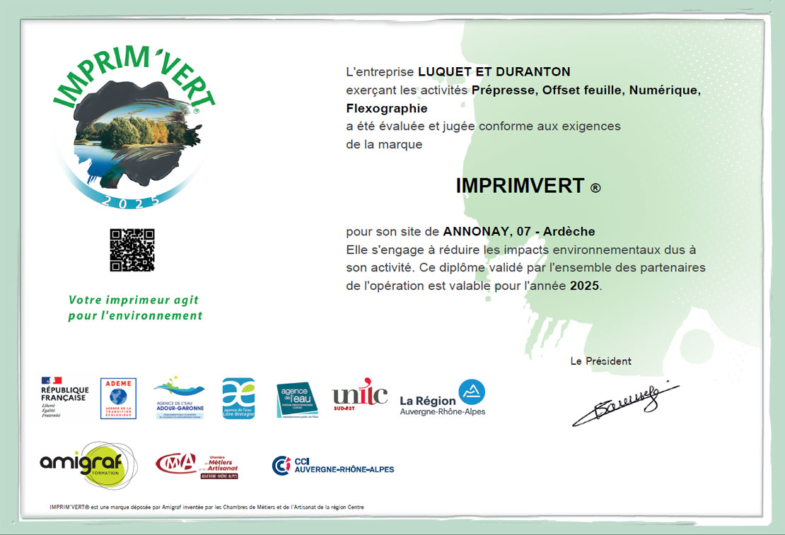 Luquet et Duranton certifié imprim'vert pour 2025