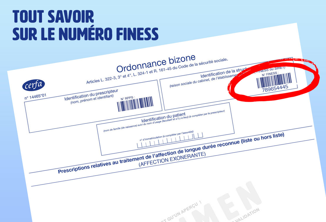 Le numéro FINESS est un code alphanumérique de 9 caractères. Les deux premiers caractères indiquent le département d’implantation du professionnel de santé, tandis que les sept caractères suivants constituent un code unique attribué au professionnel ou à l’établissement. Ce numéro est la clé de voûte de l’identification dans le domaine de la santé en France. Il est parfois indispensable et obligatoire pour obtenir certains documents comme les ordonnanciers permettant de prescrire des médicaments ou du matériel médical.