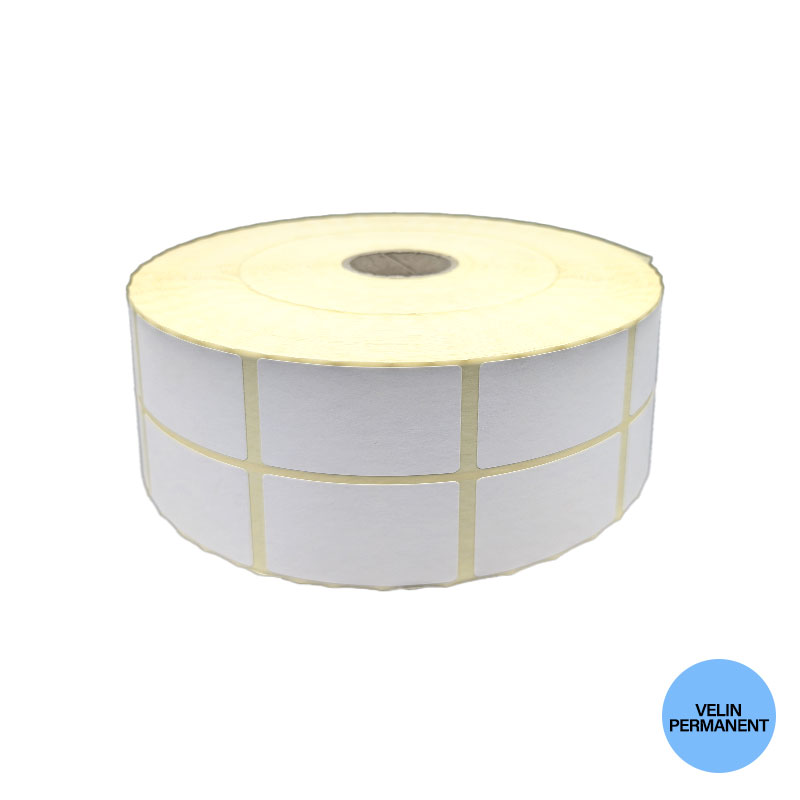 Rouleau d’étiquettes adhésives sans impression. Format des étiquettes : 38×54 mm Matière : vélin adhésif renforcé
